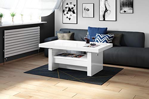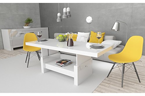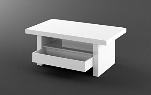 Ein wunderschöner und sehr praktischer Funktionscouchtisch mit einer Schublade, der problemlos zu einem Esstisch umfunktioniert werden kann. Dieser Tisch lässt sich in der Länge ausziehen und zudem noch in der Höhe verstellen. Durch einen hochwertigen Hebemechanismus (Gasdruckfedern), wird der Tisch manuell auf die möglichen Höhen eingestellt. Um die Länge des Tisches zu vergrößern, werden die beiden Oberplatten auseinandergezogen (durch das Ziehen zwar einer Platte bewegt sich automatisch die andere – ‚Synchronauszug‘) und das Verlängerungselement (ist im Tisch verstaut) wird aus der Mitte nach oben genommen.