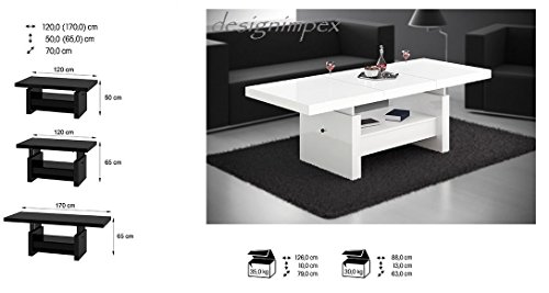 Höhe: 50 / 65 cm / Breite: 120 / 170 cm / Hölle: 70 cm (die Verlängerungsplatte wird bequem und nicht sichtbar im Tisch verstaut)