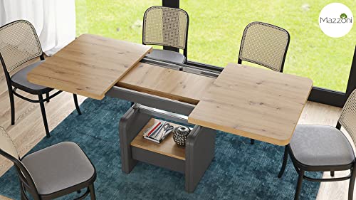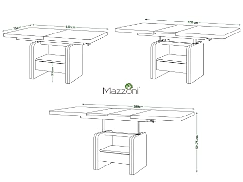 Höhe: 59 – 75 cm / Breite: 120 / 180 cm / Schlund: 75 cm (die Verlängerungsplatte wird erhebend des Weiteren keinesfalls sichtbar im Tisch verstaut)