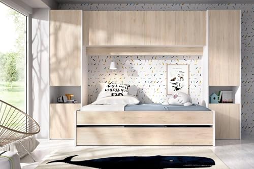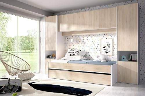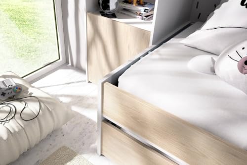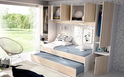 KINDERBETT VENTUROSA – Komplettes Schlafzimmer mit Bridge-Kleiderschrank und Kommode, Komposition mit Bett und Einzelausziehbett, 303 x 97 x 203 cm, Eiche und Weiß
