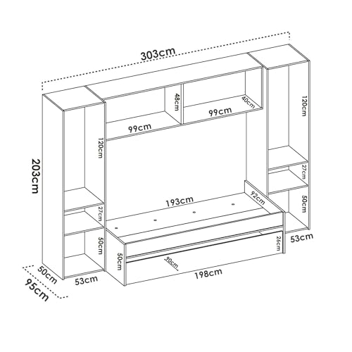 ABMESSUNGEN IN CM – Einzelbett: Länge: 303, Breite: 97, Höhe: 203