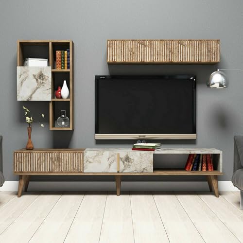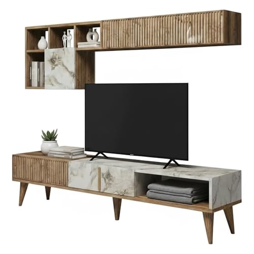 AUSSTATTETE WAND – Wohnzimmermöbel, Mehrzweck-Wohnzimmermöbel, TV-Schrank, 180 x 35 x 40 cm, Walnuss weiterhin Weiß Marmor