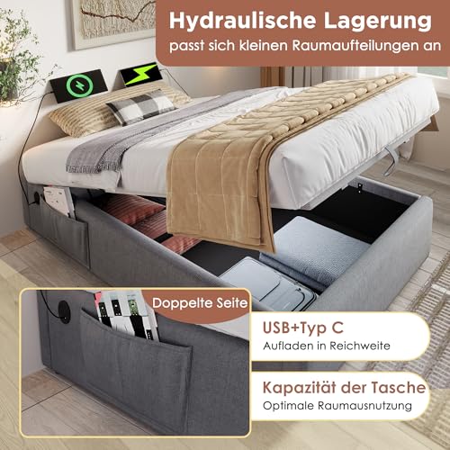Stauraum Design: Ausgestattet mit hochwertigen Hydraulikstangen und geräuscharmen Eisenbeschlägen für eine leise und geschmeidige Bedienung. Der Bettboden lässt sich mühelos anheben und senken, wodurch ein großzügiger Stauraum darunter freigegeben wird. Ideal für Bettwäsche und saisonale Gegenstände. Ein Vliesstoff am Boden schützt den Stauraum vor Staub und sorgt für Ordnung.