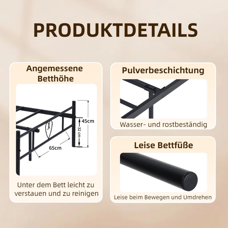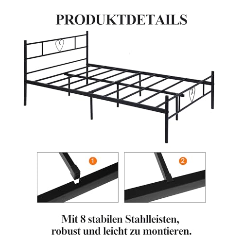 Stabiler Bett 120x190CM mit Lattenrost: Robuster Metallrahmen mit robuster Stahllattenkonstruktion – rutschfest, quietschend und geräuscharm. Die thermische Pulverbeschichtung schützt den Stahlrahmen vor Rost und Korrosion, was Stabilität und Langlebigkeit gewährleistet.