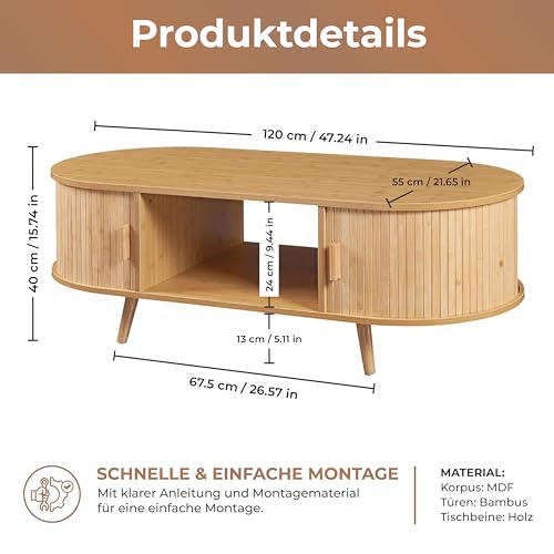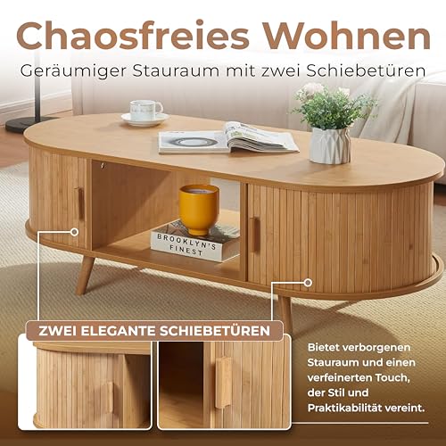 [en.casa] Couchtisch Nordkapp Wohnzimmertisch mit 2 Schiebetüren Bambus Sofatisch mit Stauraum Kaffeetisch Holzbeine 120 x 55 x 40 cm