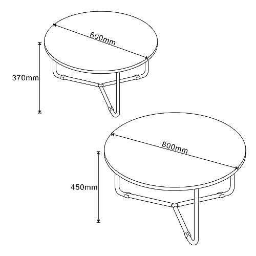 Vielseitige Abmessungen für optimale Nutzung: Der kleine Tisch misst 37 x 60 cm (Höhe x Durchmesser), während der große Tisch eine Höhe von 45 cm und einen Durchmesser von 80 cm aufweist. Die Tischplattendicke beträgt 12 mm.