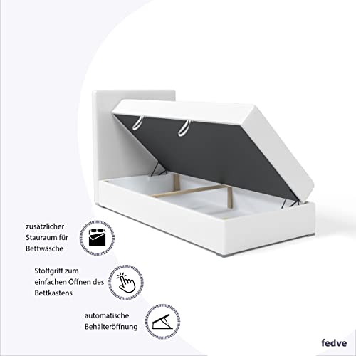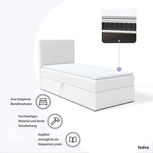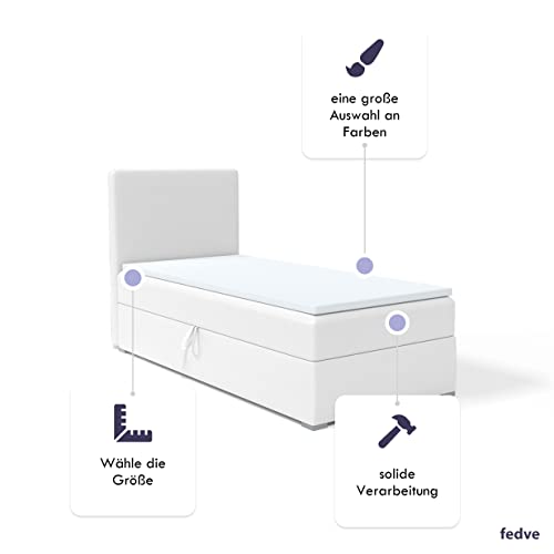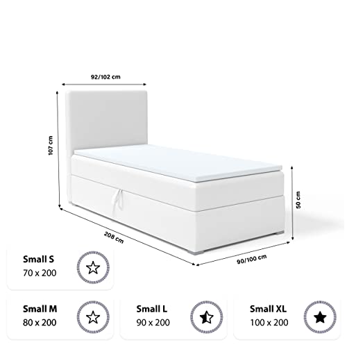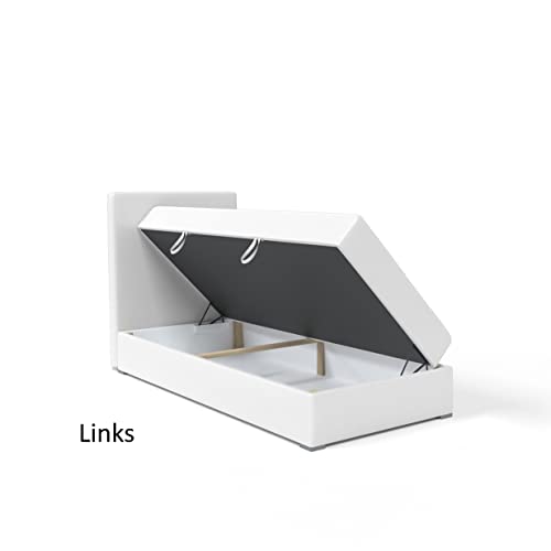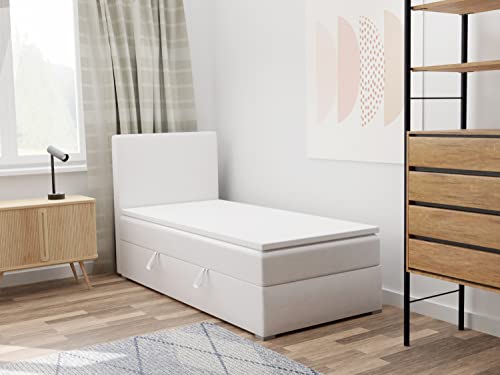 Das Kolorado Mini Bett mit Federkernmatratze ist die beste Urnengang für aufgebraucht die ein günstiges Einzelbett abgrasen. Ein praktisches Boxspringbett mit geräumigem Bett und modernem Stil! Modernes Einzelbett Kolorado mini: – Bettkasten zum Aufbewahren von Bettwäsche – Bettkopfstütze mit Kunstleder, Stoff oder zarten Stoffen gepolstert – Matratzenhärte H3 – mittelhart (bis 120 kg) – Seitenauswahl: Sie können voten, auf welcher Seite der Kasten geöffnet wird Abwicklung: Kopfstütze: gepolstert mit dem ausgewählten Stoff Publikation: T28-Schaum Matratze: Bonell-Federkern + T25-Schaum, Härtegrad H3 – mittelfest (bis 120 kg) Füße: Holz (weiß lackiert) Bettkasten: rechts oder links öffnend