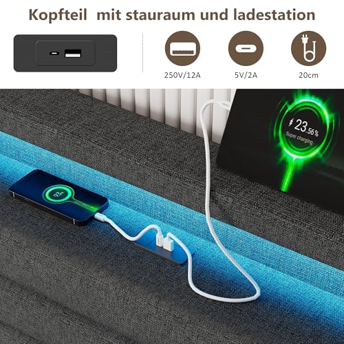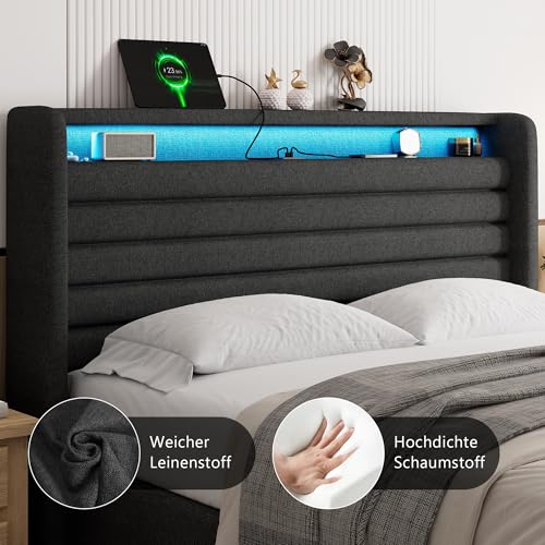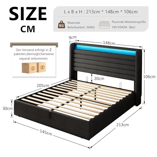 【Bett mit LED-Beleuchtung】 Mit einer farbenfrohen LED-Leiste ausgestattet ist dieses Polsterbett 140×200 cm , deren Farbe, Helligkeit und Mikrofonmodus per App oder Fernbedienung eingestellt werden kann – mit über 60.000 Farboptionen, kann in Ihrem Schlafzimmer eine romantische oder dynamische Atmosphäre sich abrackern.