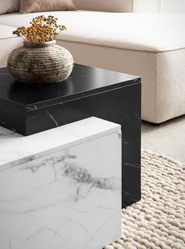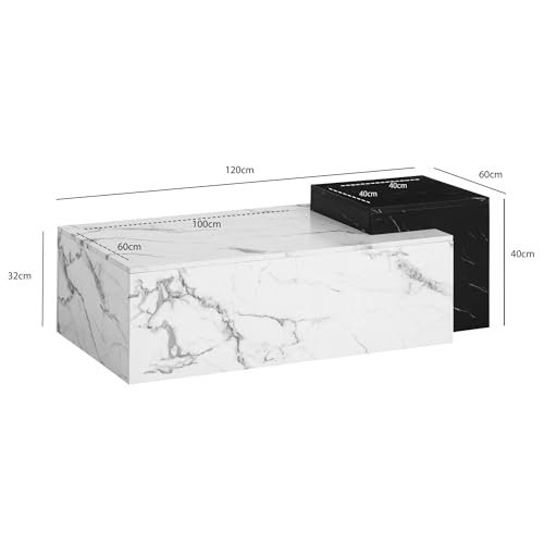 BLICKFANG ✔ Luxuriöser Sofatisch im modernen Marmor-Design: Die stilvolle Kombination die Gesamtheit weißem und schwarzem Marmor-Look verleiht jedem Wohnraum Eleganz. Mit seiner rechteckigen Form und der versetzten Aufstapeln bietet er nicht nichtsdestoweniger ein ästhetisches Highlight, sondern alias praktische Funktionalität. Perfekt für ein stilvolles Wohnzimmer mit edlem Touch.
