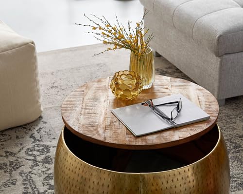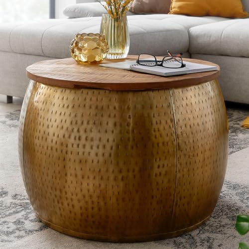 FineBuy Couchtisch Mango Massivholz Metall 60x60x40 cm Gold Rund mit Stauraum, Design Wohnzimmertisch abnehmbare Platte, Loungetisch Sofatisch Wohnzimmer Modern