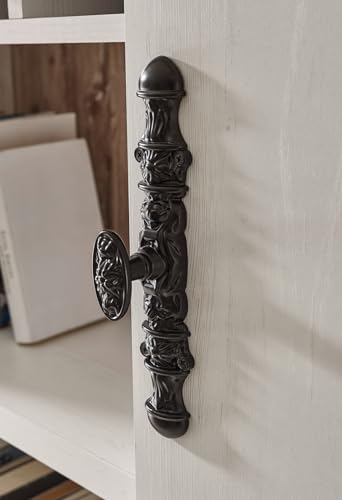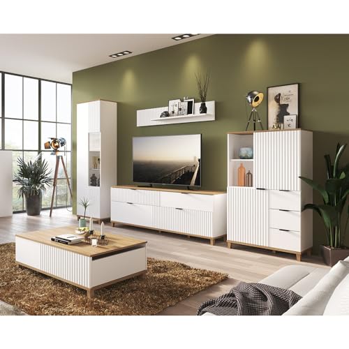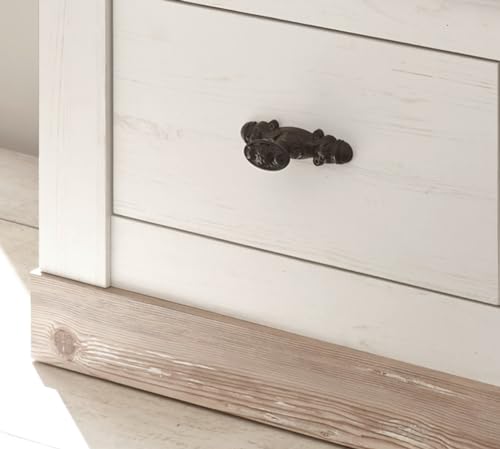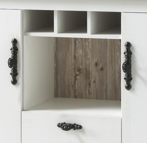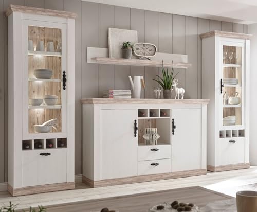 DESIGN – Die Wohnkombination ist in weiß Pinie Dekor gehalten. Die Absetzungen in Oslo Pinie Dekor fügen sich grandios in das Design ein. Die schwarzen Metall-Griffe im Altbier-Look spiegeln den gemütlichen Landhausstil gegen.