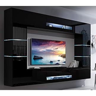 Furnitech Wohnwand Wohnzimmer Schwarz Hochglanz (257cm) – Hängend Wohnwand Modern Schrankwand mit Regale und TV Schrank Möbel ohne LED