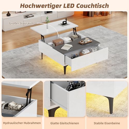 1x Couchtisch (montiert), 1x LED-Streifen mit Netzteil, 1x Bedienungsanleitung (DE/EN). 24 Monate Herstellergarantie inkl. kostenlosem Ersatzteilservice bei Defekten.