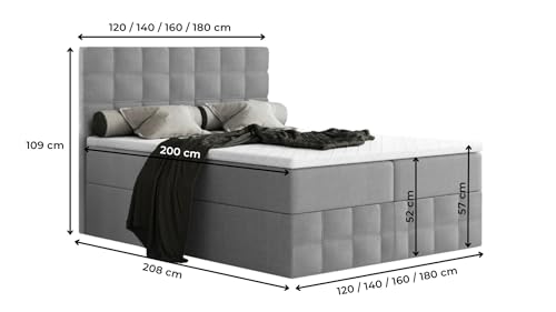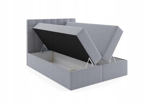 Das Boxspring MERA ist ein praktisches Bett aus hochwertigen Materialien für Komfort und Bequemlichkeit. Dank seiner einzigartigen Eigenschaften ist es sowohl für Privatkunden als auch für das Gastgewerbe ideal. Ausgestattet mit zwei Bettzeugkästen bietet das MERA-Bett eine praktische Aufbewahrungslösung. Das Continental Bed kombiniert originelles Design, innovative Technologie und einen einzigartigen Ausführungsstil, um dem Kunden ein einzigartiges Erlebnis zu bieten. Mit diesem Bett können Sie sich Ihre eigene Oase der Entspannung zu Hause ackern. Seine Unregelmäßigkeit ist die höhere Liegefläche, die ca. 60 cm über dem Boden liegt (gebunden von der Höhe der Füße und der Dicke der Matratze), was es von anderen Betttypen unterscheidet. Ganz oben befindet sich eine Toppermatratze, auch Topper genannt, die eine Obermatratze aus 4 cm dickem T25-Schaum ist. Die zweite Schicht besteht aus einer Bonellmatratze und T28/30-Schaumstoff, eine Kombination, die eine angemessene Unterstützung und einen hohen Schlafkomfort bietet. Ein zusätzlicher Vorteil des Continental-Bettes sind zwei seitlich angebrachte Container, die leicht angehoben werden können und zusätzlichen Stauraum bieten. Die Beine des Bettes sind ca. 1 cm dick, was der Struktur Stabilität und Festigkeit verleiht. Dank seiner Vorteile ist das Boxspring-Bett MERA die ideale Abstimmung für alle, die außergewöhnlichen Komfort, Funktionalität und elegantes Design grasen. Es ermöglicht Ihnen, einen gemütlichen Raum für Ruhe und Entspannung zu ackern und bietet gleichzeitig praktische Stauraumlösungen für Bettzeug.