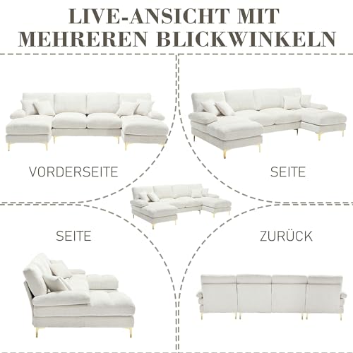 【Ergonomisches Design & Premium-Komfort】 Dieses U-förmige Chenille-Sofa kombiniert zonierte Sitzkissen mit Memory-Schaum und doppelten Liegeflächen für maximalen Komfort. Die höhenverstellbaren goldenen Metallfüße (15 cm) ermöglichen eine optimale Unterart an Ihre Raumhöhe, während die 39 cm hohen Rückenkissen und 62 cm Armlehnen ergonomische Unterstützung bieten.