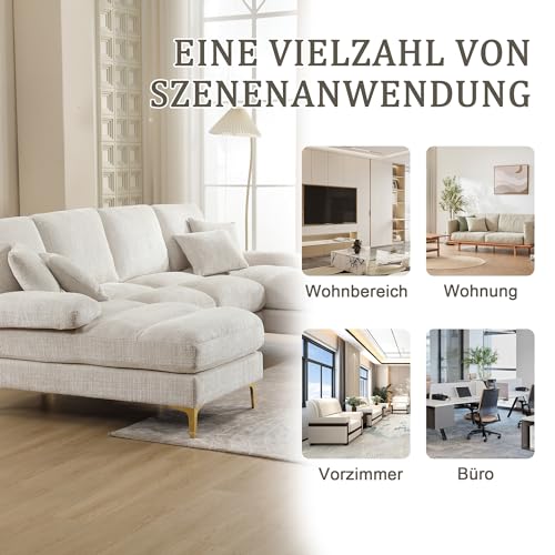 【Modernes Design & Vielseitigkeit】 Das U-förmige Sofa (272 x 136 x 88 cm) vereint elegante goldene Füße mit schlichtem Chenille-Überzug für einen zeitlosen Look. Die modulare Bauweise passt sich jedem Raum an – ob Wohnzimmer, Villa-Bibliothek oder offenes Büro. Die neutrale Farbgebung harmoniert mit jedem Dekorstil, während die schlanken Metallfüße einen modernen Akzent setzen.