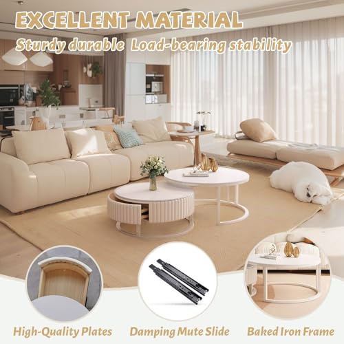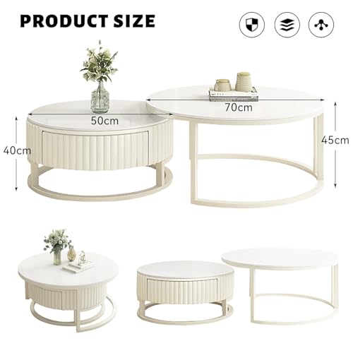 Verschachteltes Design:Weißer runder Couchtisch mit verschachteltem Design, die Größe der beiden Couchtische kann anpassbar kombiniert werden, um Platz zu sparen und die Bedürfnisse verschiedener Gelegenheiten zu absolvieren. Bei Nichtgebrauch kann der kleine Couchtisch in den großen Couchtisch eingebettet werden, um die Ordnung des Wohnzimmers zu bessern.