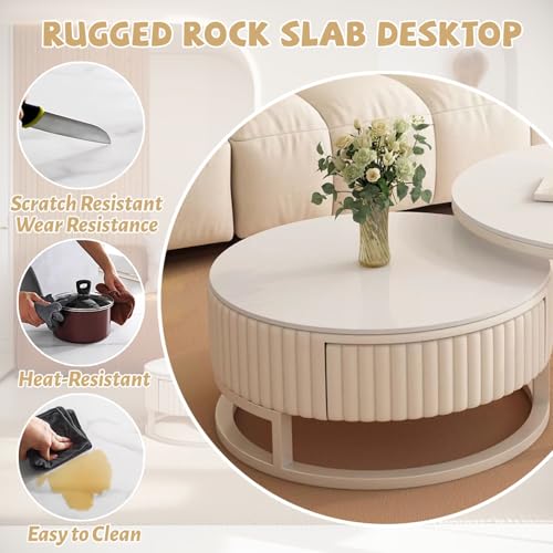 Hochwertige Steinplatte:Der runde Couchtisch ist leer hochwertiger weißer Steinplatte gefertigt, mit harter Textur, ausgezeichneter Kratz- und Verschleißfestigkeit, glatter und leicht zu reinigender Oberfläche, wasserdicht, schmutzabweisend und lang anhaltendem, sauberem Glanz.