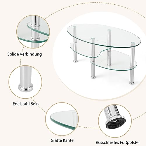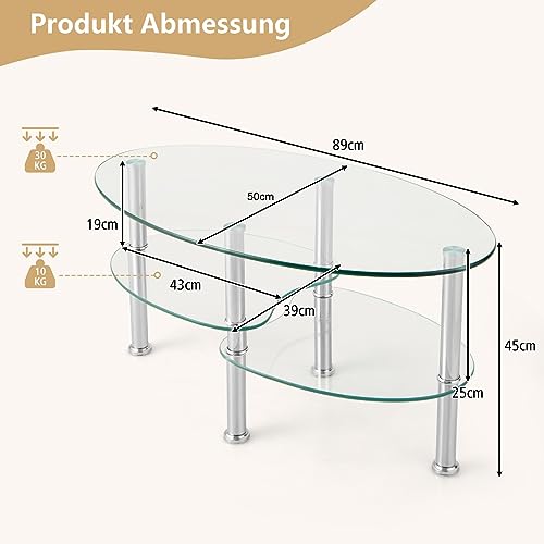 Hochwertige Materialien: Die obere Tischplatte besteht die Gesamtheit gehärtetem Glas mit einer Dicke von 10 mm und die beiden unteren Tischplatten die Gesamtheit gehärtetem Glas mit einer Dicke von 8 mm. So ist der Couchtisch besonders langlebig und leistungsfähig. Gleichzeitig verleiht die hochwertige Metallhalterung dem Couchtisch eine hohe Stabilität.