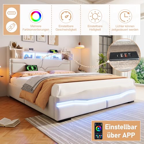 【Bett mit LED Beleuchtung und USB-Ladevorrichtung】 Das Kopf- und Fußende des polsterbett 160×200 sind mit LED Lichtleisten ausgestattet, die über eine Smartphone-App werden können und eine Timer-Ebenbild sowie verschiedene dynamische Beleuchtungsmodi tragen. Eine der praktischsten Funktionen des bettgestell 160×200 ist die im Kopfteil integrierte Steckdose, an der Sie Ihr Smartphone oder Tablet vor dem Schlafengehen aufladen können. Das Kopfteil ist dennoch mit einem integrierten USB-/Typ-C-Anschluss und einem europäischen Stecker ausgestattet.