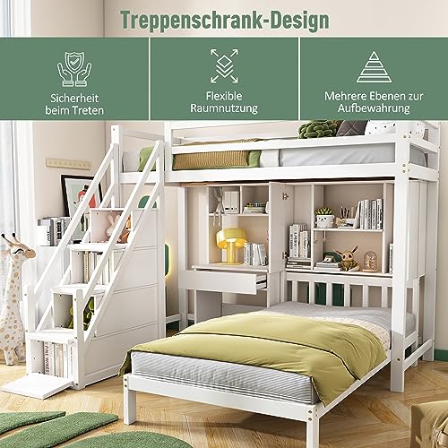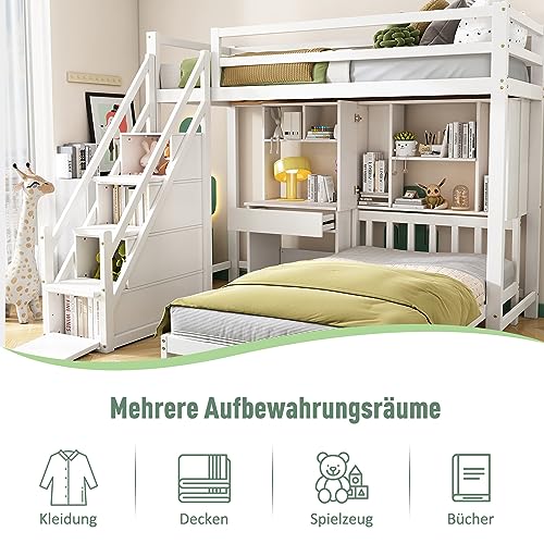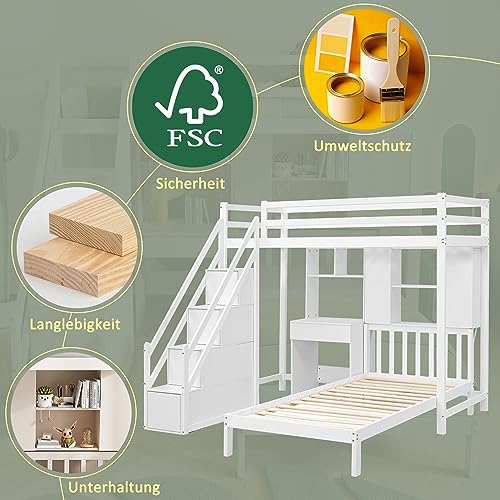 Etagenbett, Doppelbett, multifunktionales Kinderbett, Stauraum mit Schreibtisch und Regal mit Lattenrost, weiß, 90*200
