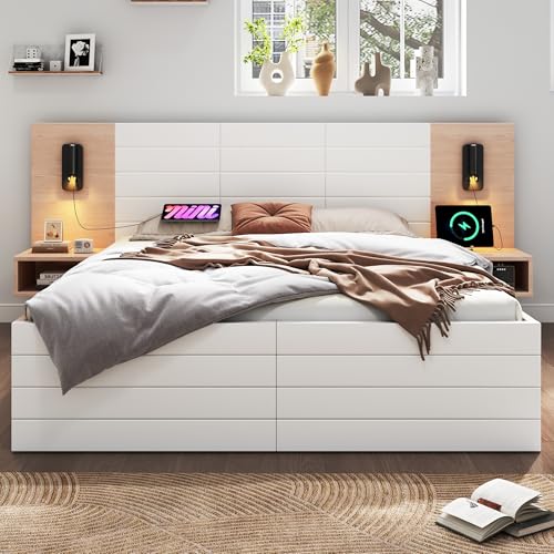 Erfüllt verschiedene Aufbewahrungsbedürfnisse: Zwei geräumige Nachttische bieten Platz für häufig genutzte Gegenstände qua Brillen, Bücher und Handys. Unter dem Bett befinden sich zwei Schubladen mit den Maßen 90x68x10 cm (L×H×B), die adaptiv entweder alternativ oder rechts platziert werden können. Dies ermöglicht eine effiziente Raumnutzung und zusätzliche Staufläche für Koffer oder Kartons.
