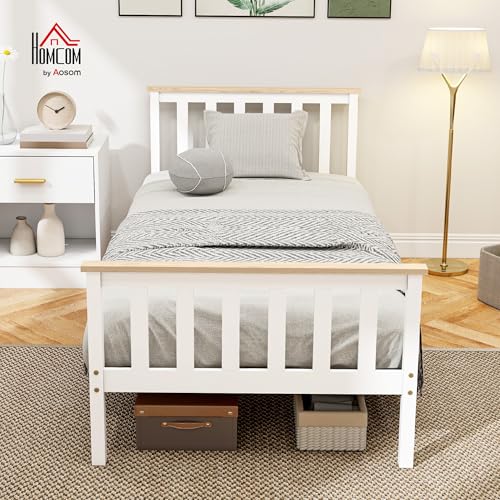 HOMCOM Bett 90 x 200 cm Bettrahmen mit Lattenrost, Unterbettaufbewahrung, Einzelbett aus Holz, Bettgestell mit Kopfteil, einfache Montage für Schlafzimmer Gästezimmer Natur+ Weiß
