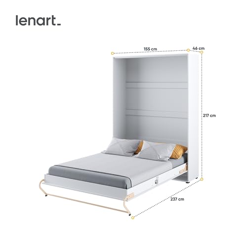BEQUEMLICHKEIT UND KOMFORT: Die maximale Matratzenhöhe beträgt 18 cm. Das Produkt besteht aus melaminbeschichteten Platten (22 mm Korpusstärke, 16 mm Front) in mattem Weiß oder Hochglanzweiß. Maße im zusammengeklappten Zustand: 153 cm Breite, 217 cm Höhe, 46 cm Abgrund; ausgeklappt: 153 cm Breite, 217 cm Höhe, 237 cm Abgrund. Das Bett wird ohne Matratze, zusätzliche Regale/ Zubehör und ohne Beleuchtung verkauft. Korpus: Mattweiß Front: Glänzend Weiß