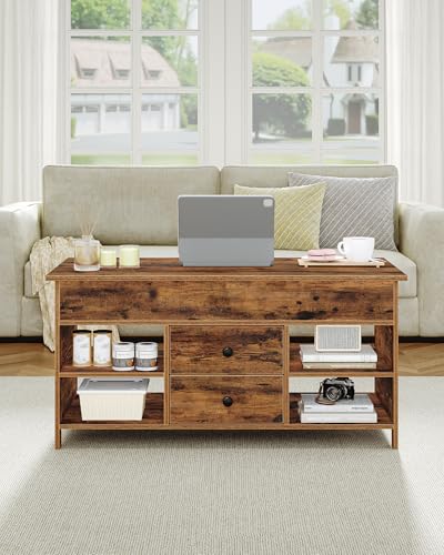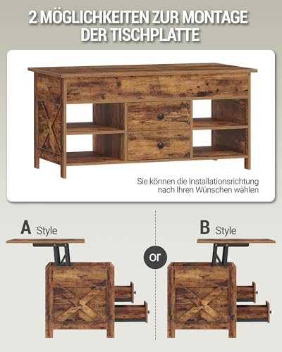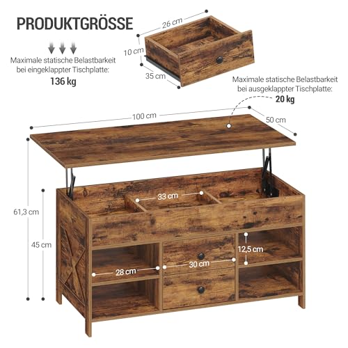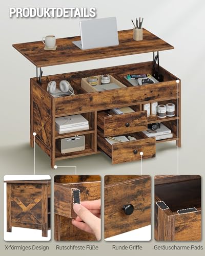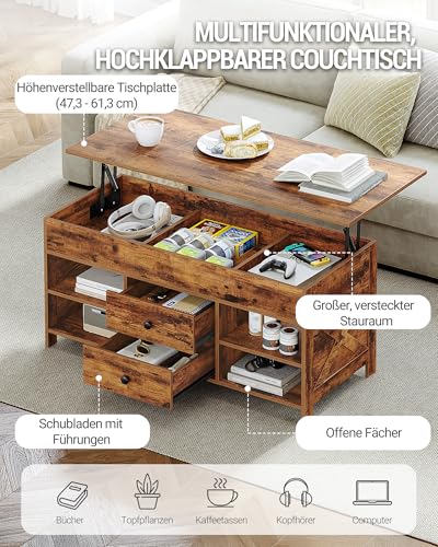 【Geräumiger Stauraum】Zusätzlich zu seiner geräumigen Tischplatte von 100 x 50 cm verfügt dieser Wohnzimmertisch über 2 Schubladen, 4 offene Fächer und 3 versteckte Fächer, die en masse Stauraum für Zeitschriften, Fernbedienungen und Kaffeezubehör bieten. Die Kombination aus offenem und verstecktem Stauraum ermöglicht es Ihnen, Ihre Lieblingsgegenstände zu vorführen und gleichzeitig Unordnung aus dem Blickfeld zu halten, sodass Ihr Wohnzimmer jederzeit aufgeräumt bleibt