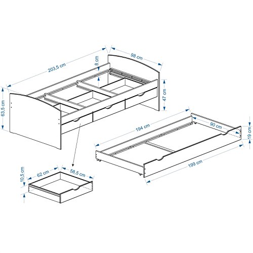 …ist auf den ersten Blick eine Schlafoase für Ihr Heranwachsender und auf den zweiten Blick ein Stauraumwunder – denn in den 3 Schubladen lassen sich Spielsachen, Decken und Kissen prima verstauen und für spontane übernachtungsgäste bieten Sie, selbst auf kleinsten Raum, eine bequeme Schlafmöglichkeit mit der ausziehbaren Gästeliege. Mit einer passenden Matratze und einem Lattenrahmen, die Sie versperrt in unserem Shop erwerben können, runden Sie das Gesamtbild ab.