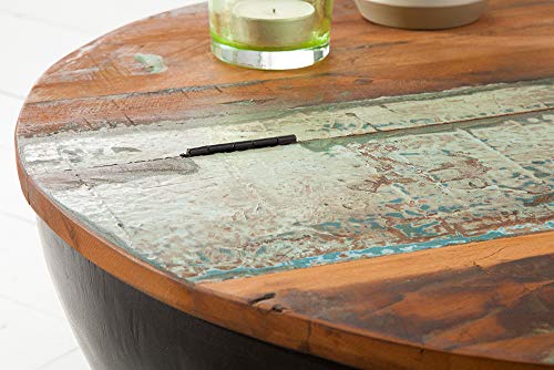 Die massive Tischplatte alle recyceltem Holz kann seitlich umgeklappt werden, so bietet der Couchtisch Stauraum für Decken, Kissen oder Plan B Wohnaccessoires