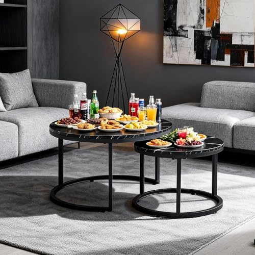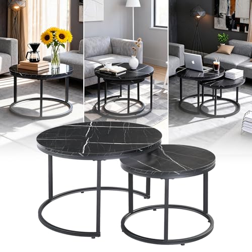 JoyyeSpace Couchtisch 2er Set, Beistelltisch, Wohnzimmertisch, Couchtisch Höhenverstellbar, für das Wohnzimmer, Couchtisch Rund Holztisch mit Schwarzem Metallgestell, Durchmesser 70/50 cm, Schwarz