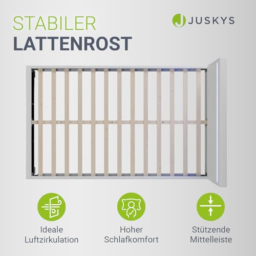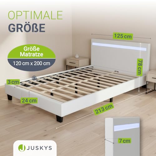 Juskys Polsterbett 120×200 cm – Bett Paris mit LED Beleuchtung, Lattenrost & Kopfteil, modernes Doppelbett aus Kunstleder & Holz – Weiß