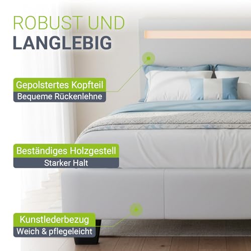 ✅ Traumhafter Schlafplatz: Gemütliches Polsterbett 120 x 200 cm in Weiß mit zweigeteiltem Lattenrost & Kopfteil mit LED-Beleuchtung; für gesunden und erholsamen Schlaf nach einem ereignisreichen Tag