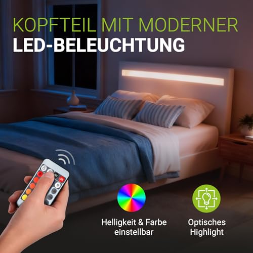 ✅ Es werde Licht: LED-Beleuchtung im 78 cm hohen Kopfteil für angenehmes indirektes Licht; in 16 verschiedenen Lichtfarben; bequem per Fernbedienung einstellbar; Orientierung auch im Dunkeln