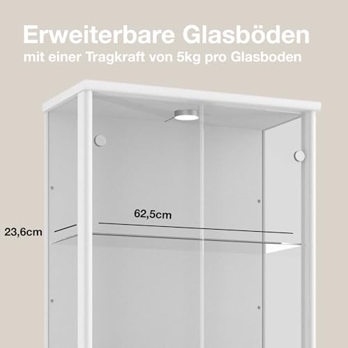 K-Möbel Vitrinenschrank 2-türig (176x67x33cm) – Made in Germany – Standvitrine Weiss mit 4 höhenverstellbaren Glasböden & LED – Glasvitrine Stehend – Vitrine Glas – Display Cabinet