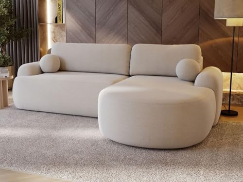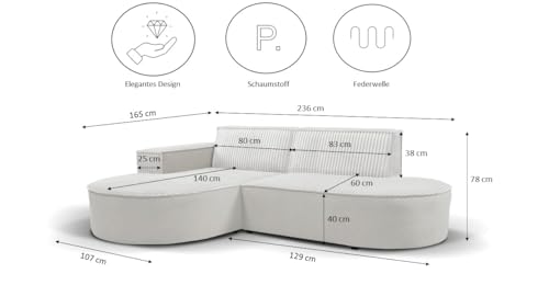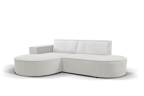Kaiser Möbel – Ecksofa mit Wohnlandschaft, Eckcouch L-Form, Sofa 3-sitzer, Polstersofa, Bequemes Couch mit Ottomane für Wohnzimmer, Relaxsofa, Plüsch Cord, Modena Studio, Soft, Ecru, Links