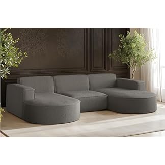 Das U-förmige Ecksofa Modena Studio mit dem hochwertigen Stoffbezug Quelle (Bouclé / Lammfell) verbindet Stil, Komfort und Funktionalität in einem Möbelstück. Die großzügige U-Form schafft ausreichend Platz für Familie und Gäste, zumal die luxuriöse Oberfläche des Quelle-Stoffs Ihrem Zuhause eine warme, einladende Atmosphäre verleiht.