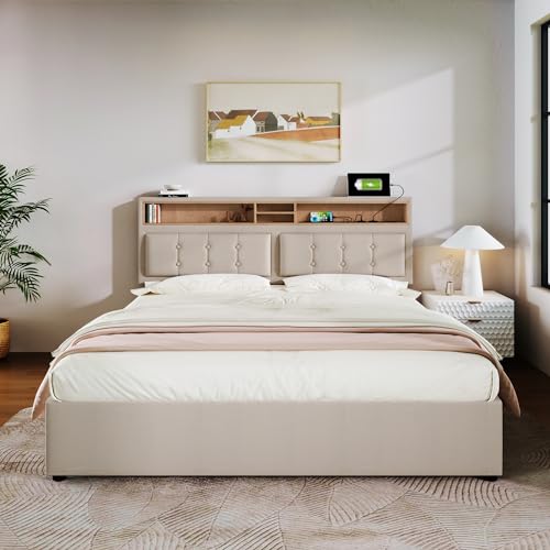 【Flexible und geräumige Aufbewahrung】Das 50 cm hohe Kopfteil verfügt über ein Schrankdesign mit vier großzügigen Fächern. Großer Stauraum unterhalb des Lattenrosts mit unbegrenzt Stauraum für die Aufbewahrung von Decken, Kissen oder Bettwäsche, Lattenrost durch Hubzylinder leicht hochklappbar. An der Unterseite des Bettes ist ein Oxford-Tuch adäquat, um Staub fernzuhalten.