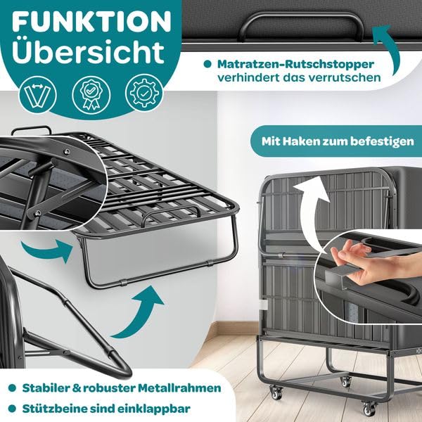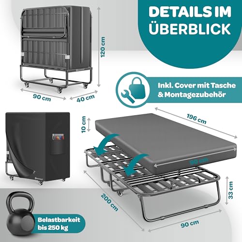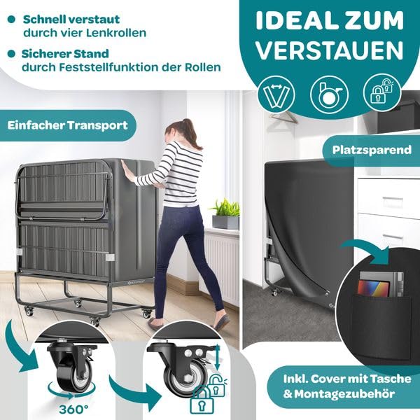 𝐒𝐂𝐇𝐍𝐄𝐋𝐋 𝐕𝐄𝐑𝐒𝐓𝐀𝐔𝐓: Im Zuge der vier Lenkrollen mit Feststellfunktion lässt sich das Bett schnell und einfach transportieren und stabil abschalten. Dies ist äußerst patent, wenn Sie das Bett häufig bewegen oder verstauen müssen. Ideal anstelle Gästezimmer, Wohnzimmer, Dachboden oder Büro.