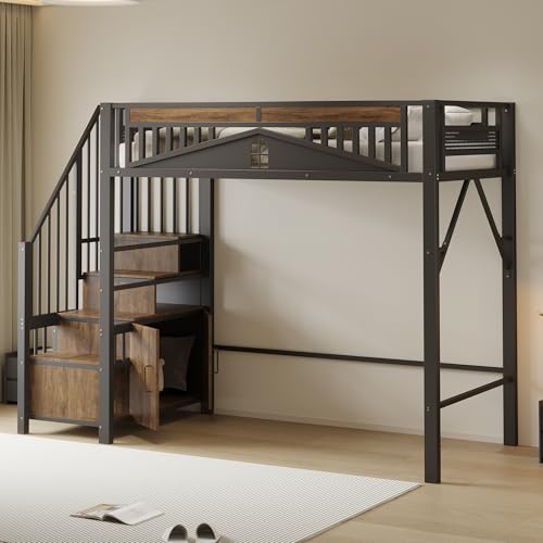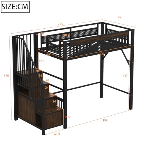 Treppenhausgestaltung mit Stauraum – Dieses Metall-Hochbett verfügt über einen eingebauten Stauraum unter jeder Trittstufe der seitlichen Kletterelemente sowie über einen kleinen Schrank für die einfache Organisation und Aufbewahrung von wichtigen Dingen.
