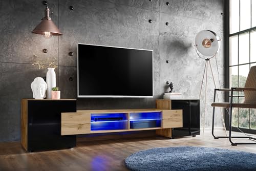 1 TV-Möbel: Breite 230 cm, Höhe 52,5 cm, Schlund 35 cm; 2 Türen; jeder der 2 abschließbaren Teile hat 1 Ablagekasten; 2 Glasablagen in der Mitte des Schranks mit LED-Beleuchtung (optional); inklusive Füße.