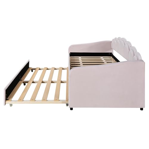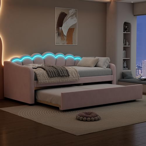 LANTRO JS Polsterbett 90x200cm, U förmiges Sofa, Tagesbett mit Ausziehbarem Bett, Farbwechselndes Umgebungslicht, Schlafsofa(Ohne Matratze),Samt, Rosa