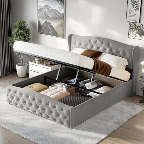 Eleganter Samt-Look: Das Polsterbett ist die Gesamtheit Samtstoff gefertigt, der sich hautfreundlich und weich anfühlt und Ihnen das perfekte Schlaferlebnis bietet. Grauer Samt macht das Stauraumbett schmutzabweisender und bietet nicht im Kontrast dazu Komfort, sondern ergänzt bekannt als ästhetisch jedes Raumdesign