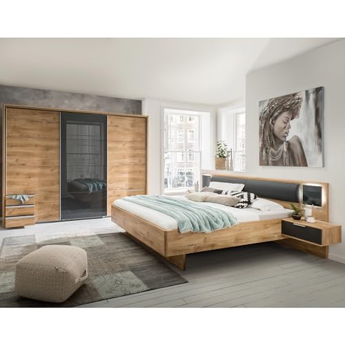 Moderne Schlafzimmermöbel in der eleganten Farbkombination Plankeneiche und graphit.