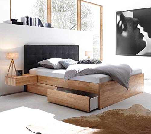 Echtholzbetten aus Fichte oder Eiche in Kombination mit verschiedenen Fußgestellen aus Metall oder Echtholz lassen sich mit ebenfalls aus Echtholz gefertigten Nachttischen und Unterbett-Schubladen folgern. Die gewollten Wuchsrisse im Holz machen dein Schlafzimmer einzigartig.