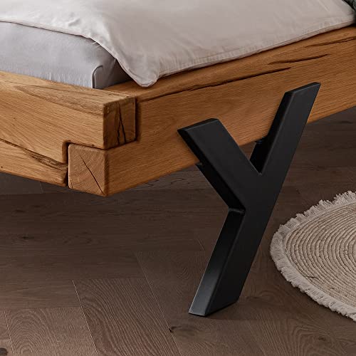 MATERIAL – Bettrahmen: Massivholz, Wildeiche Natur; Füße: Metallfüße, schwarz, in Y-Form; Kopfteil: Leder; Beschläge: Metall