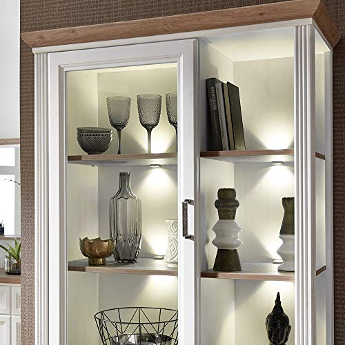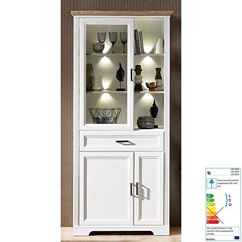 1x Vitrine, 1 Glas-/Holzrahmentür, 2 Holztüren, 3 offene Fächer, 1 Schubkasten, LED-Beleuchtung, Zuleitung mit Schuko-Stecker, BxHxT : 93/204/42 cm