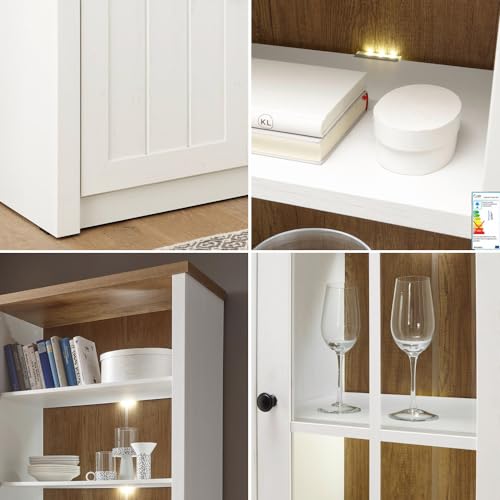 MATERIAL – Front: MDF, melaminbeschichtet, Pinie weiß; Korpus: E1-Spanplatte, melaminbeschichtet, Pinie weiß; Dekor / Absetzungen: Eiche hell Dekor; Beschläge & Scharniere: Metall; Griffe: Muschelgriff, Metall, schwarz; Glas: Klarglas 5mm (ESG-Sicherheitsglas); Beleuchtung: LED-Rückwandbeleuchtung, A++