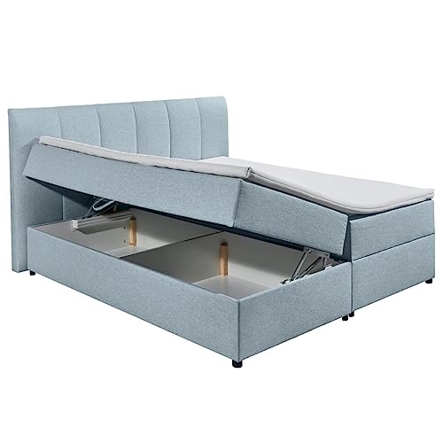 MATERIAL – Farbe: Colet 83 pastellblau; Stoff: 100% Polyester; Topper: Komfort T25 Schaum-Topper (6 cm), Bezug waschbar bis 40°; Matratze: 9-Zonen-Tonnentaschenfederkern, 1 Lage mithilfe 2 cm Schaum T25; Gestell alle hochwertigen Holzwerkstoffen; Kunststofffüsse